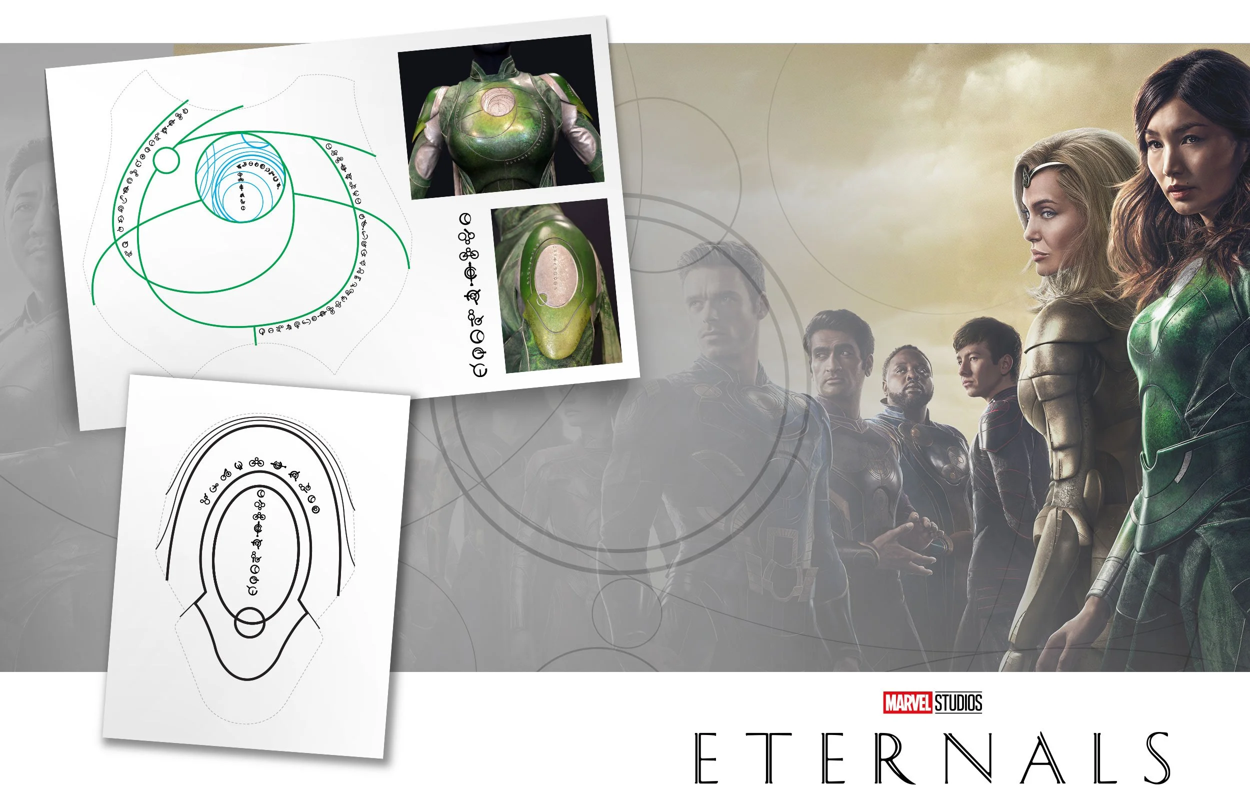 I redesigned and refined the rune-based symbology used across the Eternals’ armor, contributing to a cohesive visual language representing elemental and cosmic concepts. I also developed a series of Eternal-themed bracelet designs incorporating this system.